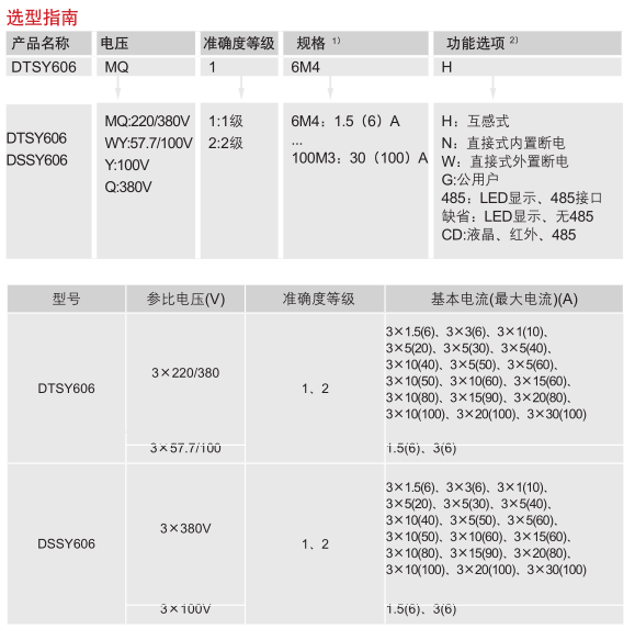 如客戶需要互感式的DTSY606三相四線電子式預(yù)付費(fèi)電能表,電壓為220/380V,準(zhǔn)確度等級為1,電流規(guī)格為1.5(6)A,LED顯示、帶485接口則相對應(yīng)的訂貨編碼為:DTSY606MQ16M4H485