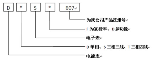 D電能表、T三相四線(S三相三線)、S代表電子表、F代表分時計量、607為我公司產(chǎn)品注冊號