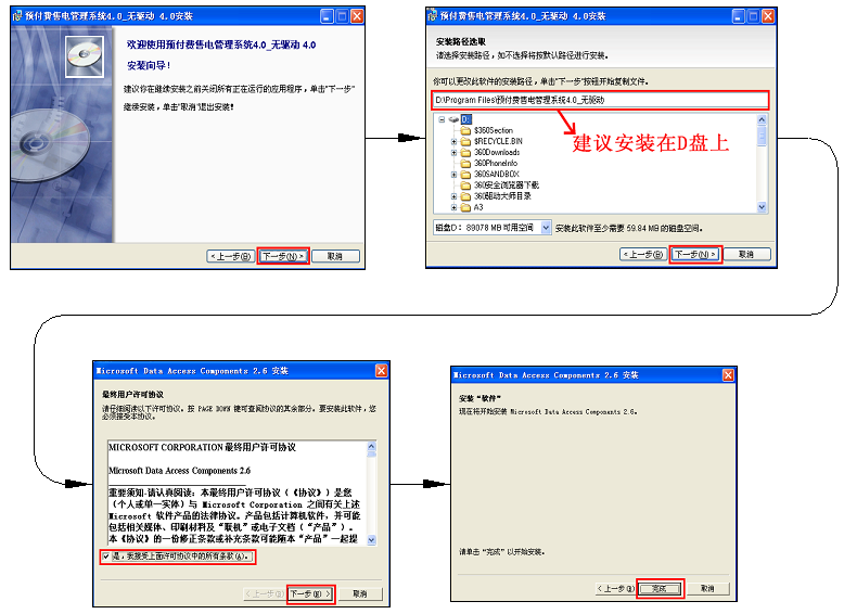 打開光盤中"預(yù)付費(fèi)售電管理系統(tǒng)4.0_無驅(qū)動(dòng).exe",按以下步驟進(jìn)行安裝。