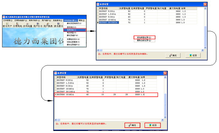 點(diǎn)擊下圖中"系統(tǒng)信息設(shè)置"->"電表類型",打開表型設(shè)置,點(diǎn)擊鼠標(biāo)右鍵,添加表型記錄,再逐一添加類型規(guī)格、報(bào)警電量、最大購電量等,再點(diǎn)確認(rèn)、返回。