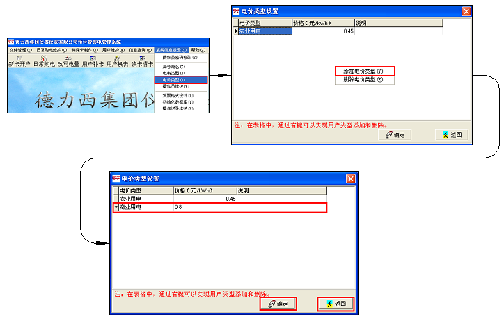 點(diǎn)擊下圖中"系統(tǒng)信息設(shè)置"->"電價(jià)類型",打開電價(jià)類型設(shè)置,點(diǎn)擊鼠標(biāo)右鍵,添加電價(jià)類型,再逐一添加電價(jià)類型、電價(jià),再點(diǎn)確認(rèn)、返回。