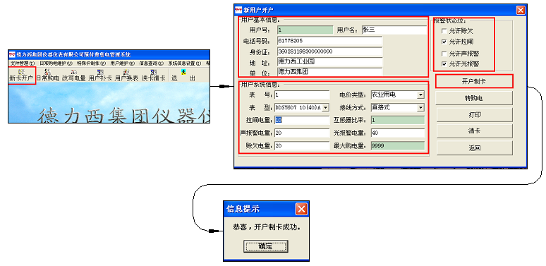 新IC卡插入讀卡器,打開新卡開戶,輸入用戶名、表號(hào)、選擇電價(jià)類型、表型、接線方式;再選擇報(bào)警方式;完成后點(diǎn)擊開戶制卡。