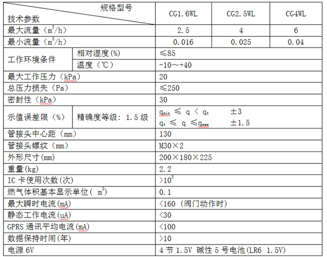 CG1.6WL/CG2.5WL/CG4WL 無線遠傳膜式燃氣表是以膜式燃氣表為計量基表,加裝流量信號采集模塊、GPRS無線傳輸模塊、IC卡模塊、閥門控制模塊及電源管理模塊等所組成的新型智能燃氣表。該表除具有煤氣、天然氣、液化石油氣等燃氣的體積計量功能外,還具有計量數(shù)據(jù)機電轉換、無線數(shù)據(jù)傳輸、閥門遙控等功能。技術指標符合GB/T 6968 《膜式燃氣表》,JJG 577 《膜式燃氣表》。