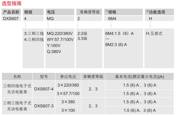 如客戶需要三相四線電子式無功電能表,電壓為220V,準(zhǔn)確度等級為2,電流為1.5(6)A,