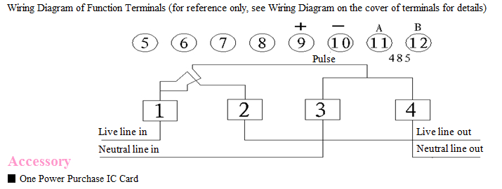 ■Prepayment for electricity use. It gives alarm when the electricity pre-purchased is less than set and cuts off power when the electricity pre-purchased is used up.