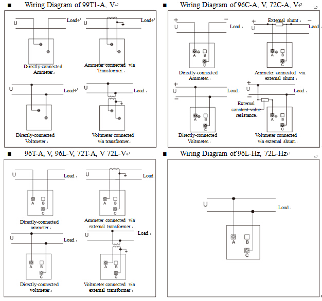 2: For AC ammeters, the current range of directly-connected Type 99 is 0.5A~20A and 1A~5A and 10A~100A for Type 72 and Type 96 respectively.